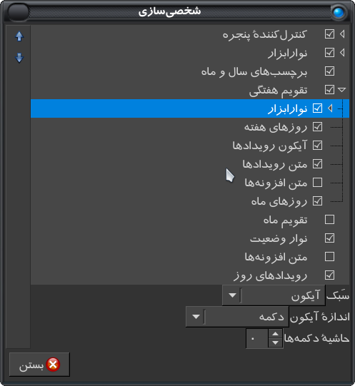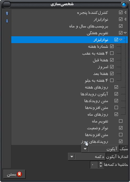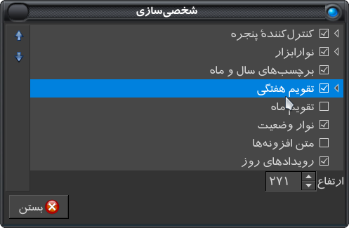 در پنجرهٔ شخصیسازی، غیر از اینکه میتونید با زدن/برداشت تیک هر قسمت، فعال/غیرفعالش کنید، با کلیک روی هر آیتم (مثل تقویم ماه، تقویم هفتگی یا آیتمهای داخلش)، گزینههای ظاهری مربوط به اون آیتم رو زیرش نشون میده. از دکمههای بالا و پایین که در سمت چپ پنجره (در حالت فارسی) هست هم میتونید برای جابجا کردم آیتمها استفاده کنید.