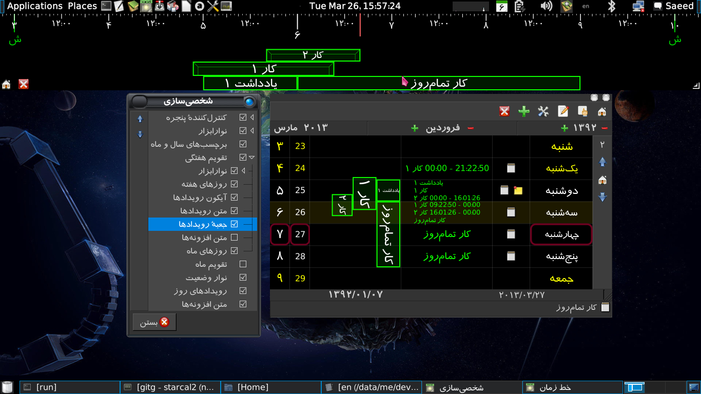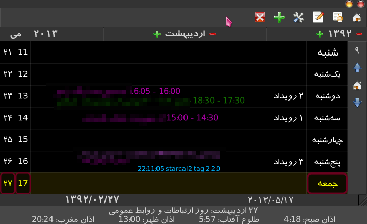 کافیاست یک «رویداد دلخواه» اضافه کنید، و قاعدهٔ «هفته-ماه» را به آن بیفزایید. - رفع تعداد باگ مهم در رویدادها (مربوط به الگوریتمهای زیرپایهای)