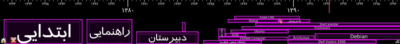 - کامیتها و تگها فعلاً در پنجرهٔ خط زمان قابل مشاهده نیستند (از آنجا که زمان کامیت/تگ فقط یک لحظه است نه یک بازهٔ زمانی)، اما امیدوارم در نسخههای بعدی راه مناسبی برای پیادهسازی آن پیدا کنم (احتمالاً از طریق تعداد خطهای اضافه و حذف شده از کد)